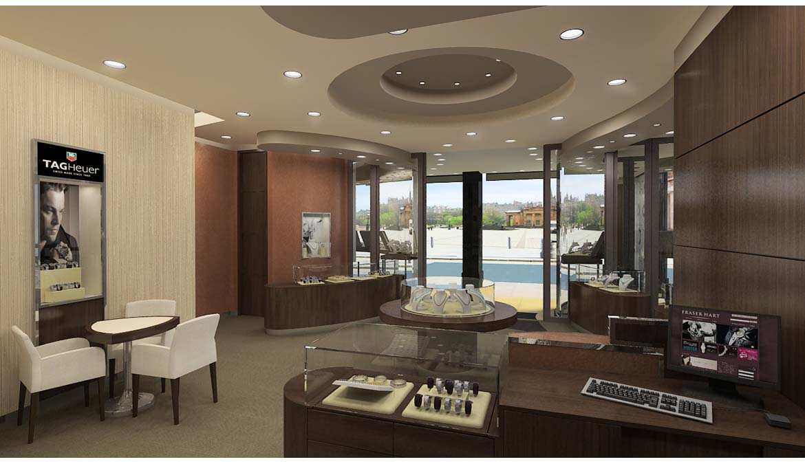 Following on from work done for a successful design pitch for a jewellery store for a new client we were commissioned by them to create 3D visuals for a number of Fraser Hart jewellery stores. The images shown here are of Edinburgh's refurbished Royal Mile store and Frasers Hart's new retail space at Westfield, Stratford.